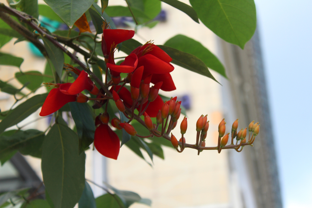 Osaka Đỏ có cụm hoa dạng chùm dài khoảng 20cm mang nhiều hoa màu đỏ tía sát nhau, nhìn rất bắt mắt. Hoa lớn có 1 cánh cờ dạng trái xoan thuôn rộng, cuộn lại. Quả đậu dài 15-25cm có màu nâu, nhẵn. Mỗi quả có từ 5-8 hạt hình thận, đỏ hay nâu. Osaka Đỏ là cây ra hoa quanh năm. Mỗi mùa hoa nở sẽ làm đỏ cả một vùng trời, thu hút nhiều côn trùng, chim chóc đến.