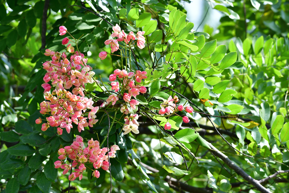 Chùm hoa lớn, dài khoảng 15cm, có nhiều hoa, các hoa nằm trên một cuống chung, cánh xòe đều ra 5 cánh có màu trắng hồng trông thanh thoát, nhẹ nhàng rất đẹp mắt, nhị hoa có màu vàng, nhụy cong. Thường ra hoa vào mùa hè (từ tháng 7-11) tùy theo vùng, hoa đẹp, sai hoa nhưng mau tàn và dễ bị sâu bệnh. Quả của cây muồng hoa đào là quả đậu hình trụ dài khoảng 15-20cm, đường kính quả 15 -20mm, mang nhiều hạt hình trái xoan, bên trong quả thịt có mùi hôi khó chịu. Có nhiều người nhìn cây và nhầm với cây ô môi hay cây hoa anh đào Hà Nội, tuy nhiên hoàn toàn khác đấy các bạn ạ, cây có cùng họ với Ô Môi ( cây có quả ăn được) và khác hoàn toàn với hoa anh Đào, nên lưu ý phân biệt.