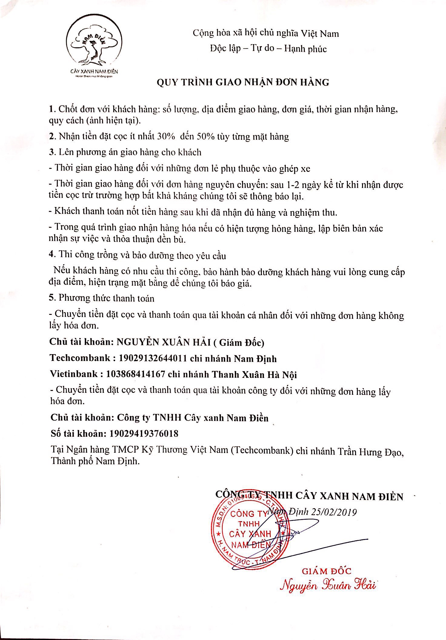 - Là Công ty cịy xanh uy tín trên thị trường nên mọi giao dịch qua tài khoản bên Công Ty TNHH Cây Xanh Nam Điền đều có xác nhận cô công ty