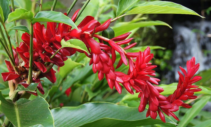 Lá cây lớn, có cuống và bẹ dài ở gốc, màu xanh bóng. Hoa màu đỏ đẹp mắt nên thường được dùng làm cây cảnh.